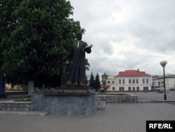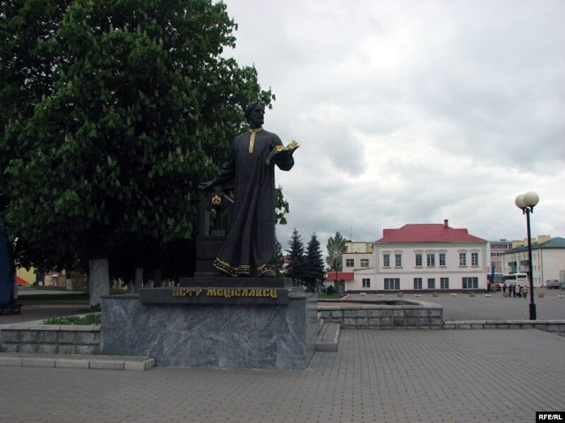 Цэнтральная плошча Мсьціслава. Перад райвыканкамам няма помніка Леніну — у адрозьненьне ад большасьці іншых беларускіх райцэнтраў. Тут ушанавалі асобу больш важную для краю — аднаго зь першых друкароў Пятра Мсьціслаўца.