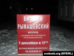 Ля будынку школы быў разьмешчаны вялікі плякат, які запрашаў на сход з удзелам Рымашэўскага. Умовы для выступу кандыдата былі добрыя, нязручных ды правакацыйных пытаньняў задавалі няшмат. Ва ўступным слове Віталь Рымашэўскі заявіў, што ідзе ў палітыку і ўдзельнічае ў выбарах на прэзыдэнта дзеля таго, каб зьмяніць Беларусь такім чынам, каб палітычнае, эканамічнае ды сацыяльнае жыцьцё краіны не супярэчыла хрысьціянскім прынцыпам і каштоўнасьцям.