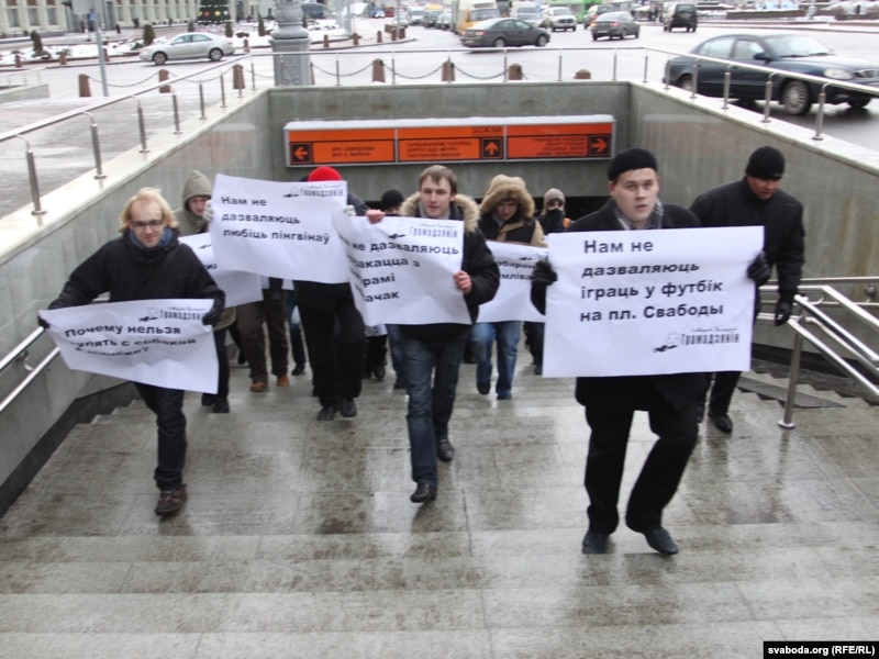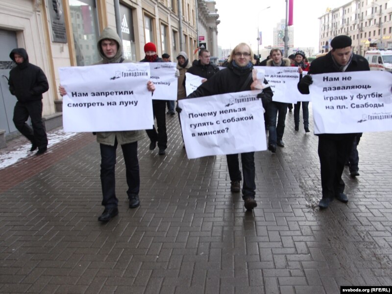 Тады ўдзельнікі, трымаючы ў руках плякаты "Нам забаранілі гучна размаўляць", "Нам забаранілі зьбірацца больш за 3 чалавекі", "Нам забаранілі піць каву", пачалі рухацца па праспэкце Незалежнасьці ў бок Кастрычніцкай плошчы.