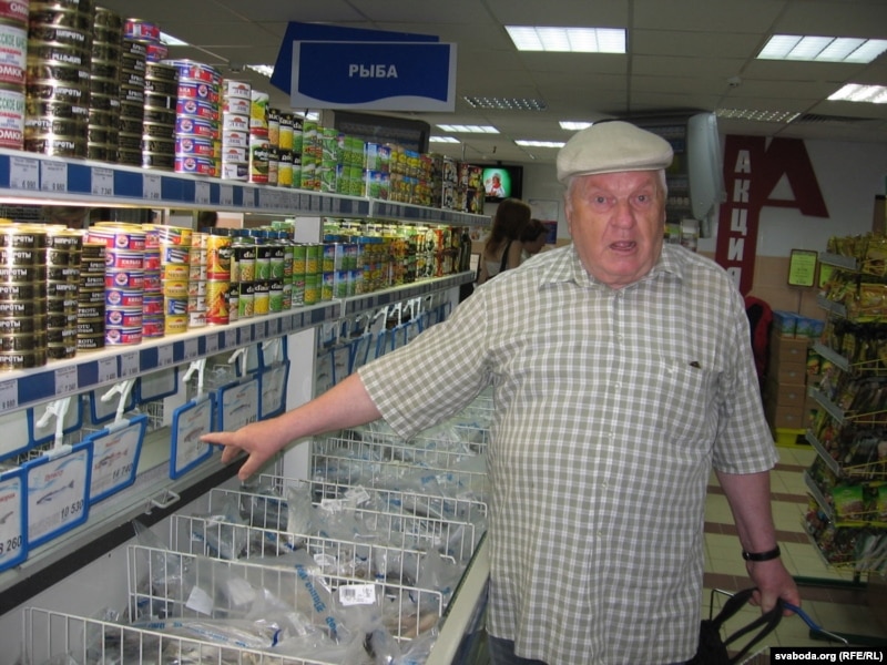 Ідзем у краму, дзе нам забараняюць фатаграфавацца, а тым больш здымаць вітрыны і цэньнікі. Аднак пасьля тлумачэньняў з аховай і адміністрацыяй усё ж працягваем напаўняць штодзённы спажывецкі кошык пэнсіянэра. А потым падрахоўваем, што купілі і колькі патрацілі: