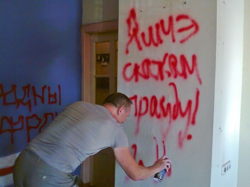 Сьцены сядзібы, якую заўтра маюць забраць камунальныя службы Менску, расьпісаныя графіці: "Жыве Беларусь!", "БНФ яшчэ скажа праўду", "БНФ назаўсёды!" На вокны павязвалі бел-чырвона-белыя стужкі.