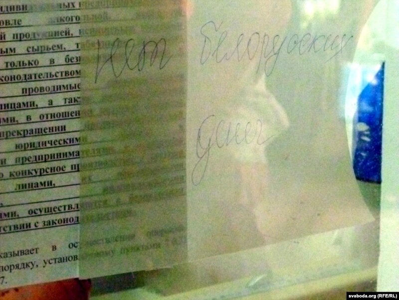 Аднак некаторыя банкі сутыкнуліся зь іншай праблемай — нестае беларускіх рублёў. Да прыкладу, перапыніў куплю валюты абменьнік «Белінвэстбанку» на Цэнтральным рынку. На таблё гэтага абменьніка значацца лічбы куплі даляра — 8 тысяч 200 рублёў, а продажу — 0 рублёў. А ў акне вывешаная папера з надпісам, што «беларускіх грошай няма».