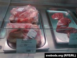 У вітрыне мяснога аддзелу ўнівэрсаму «На Нямізе» — ялавічына і сьвініна коштам 75 і 82 тысячы рублёў адпаведна. Чарга даўжынёю ў дзясятак чалавек, аднак, ня рухаецца: людзі чакаюць сечанага мяса — гэта значыць з косткамі і, адпаведна, таньнейшага. Гутару зь людзьмі: