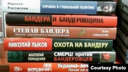 Сярод аўтараў — Лімонаў, Азараў, Каравулаў, якія пішуць пра Сьцяпана Бандэру, пра «генацыд» расейцаў ва Ўкраіне, вайну ў Данбасе — усяго прадаецца каля 20 найменьняў такіх кніжак, якія стаяць на паліцы побач з дэтэктывамі.