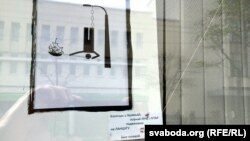 Графічныя малюнкі з тлумачальнымі надпісамі Паўла Сідаровіча сабраныя ў вітражнай выставе ў вокнах бібліятэкі.